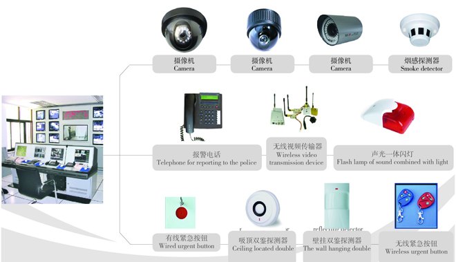 门磁系列、按钮开关系列、红外探测器系列、温感探测器系列、烟感探测器系列、气感探测器系列、主动红外探测器系列、防盗报警主机系列、频闪灯系列、警号系列、振动报警系列、水感探测器;