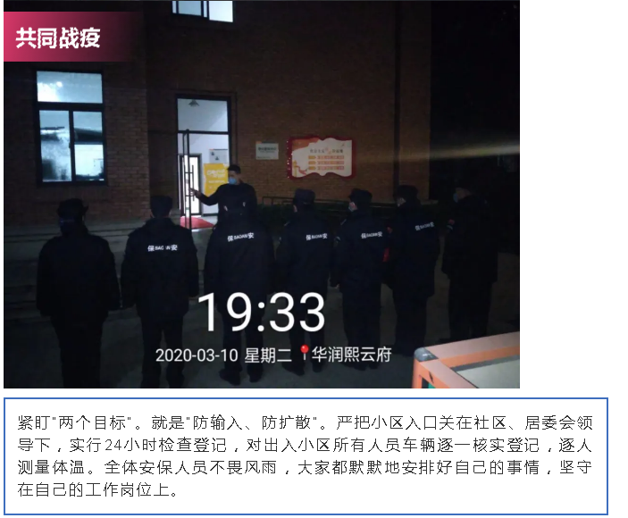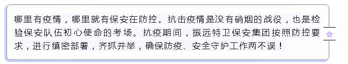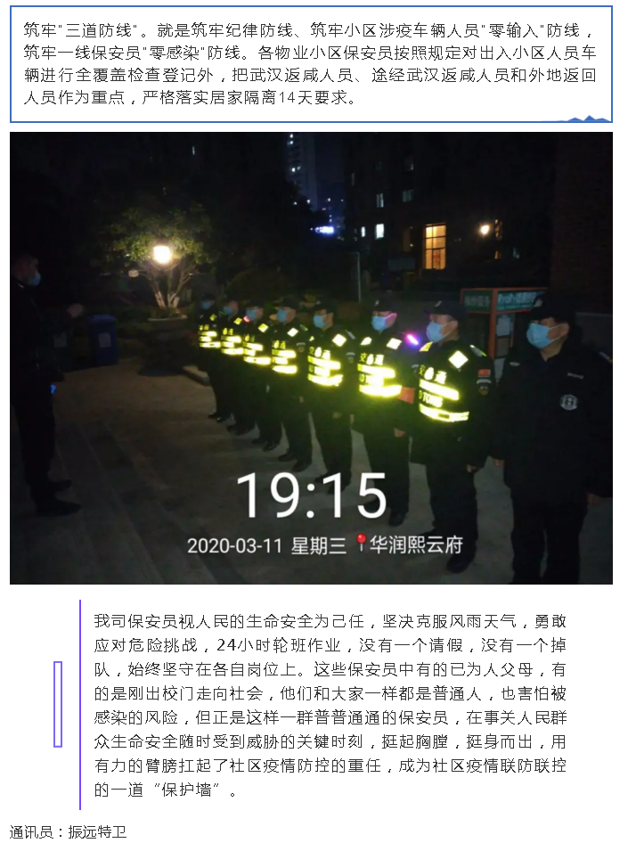 “在维护稳定工作中,我们常常忽略保安这支队伍,其实,每一名保安,对企业厂矿、单位、小区情况最了解、人员最熟悉,指导加强保安队伍建设,对维护稳定起着事半功倍的作用。”在这次疫情阻击战中,就是这支近在眼前却默默无闻的队伍,始终坚守在一线,始终在群众的身边。围绕“一个中心”。就是疫情期间稳定这个中心。振远特卫保安集团驻华云熙府驻点队长唐建胜正在对夜班疫情值勤进行工作部署和对接及白班工作讲评。