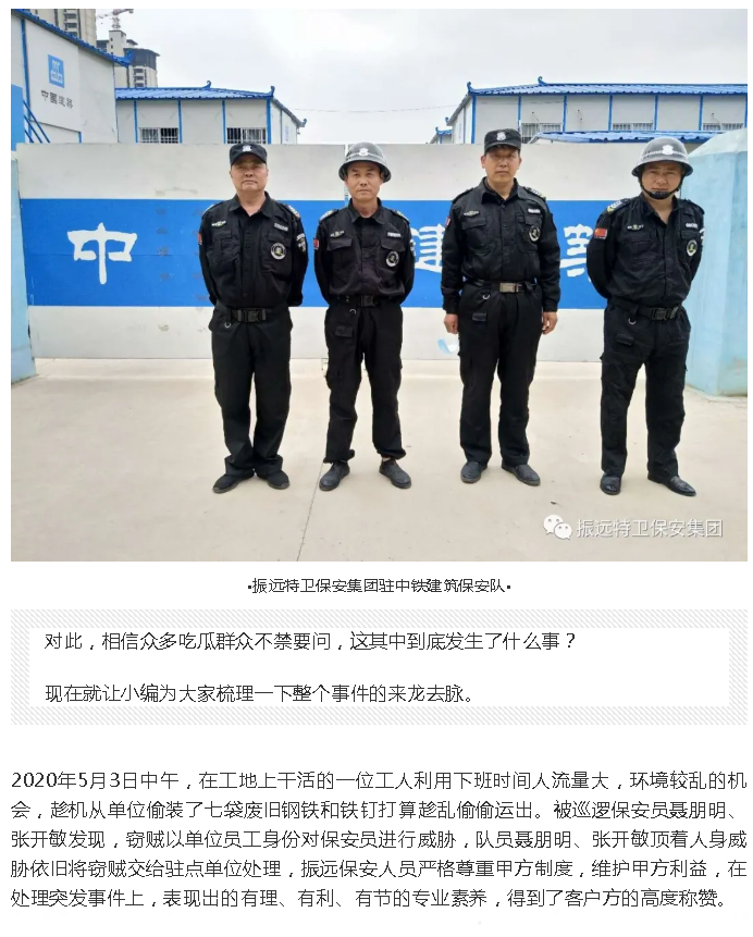 对驻中铁建筑保安队员聂朋明、张开敏及团队的表现予以高度赞扬。