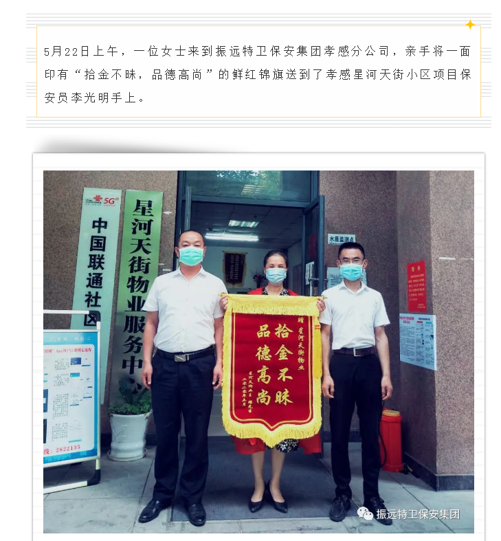 【孝感公司】完璧归赵|振远特卫保安员拾金不昧 妥善处置获得赞誉