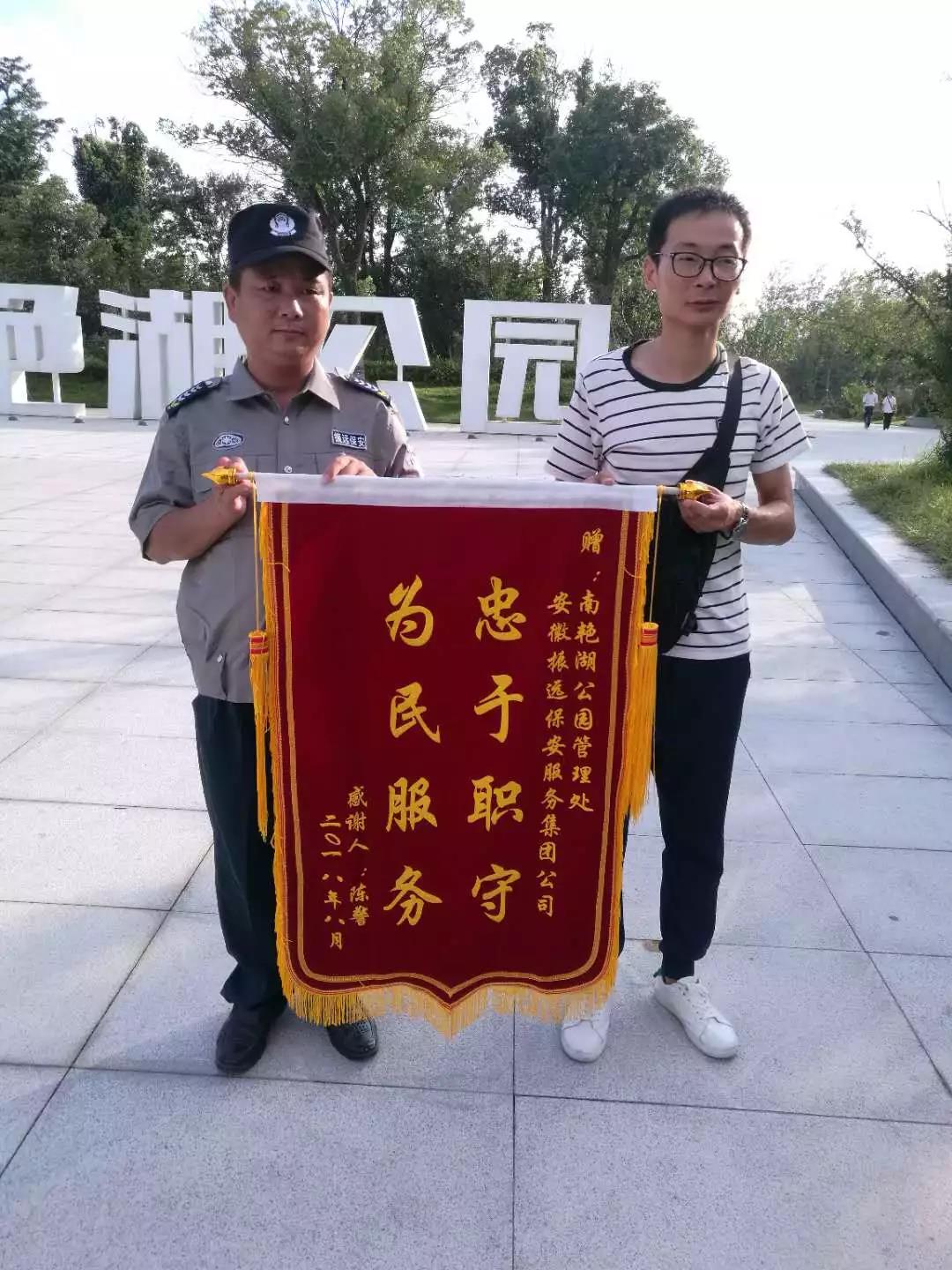 2018年8月6日下午,合肥市民陈警来到南艳湖保安管理处,送来了“忠于职守,为民服务”的锦旗和感谢信,感谢振远保安集团保安员吴长国等人救起一位轻生女子的感人事迹,这种“见义勇为、救人于危难”的高贵精神被当地群众传为佳话。事情经过是这样的: 7月21日晚上9点左右,振远保安集团驻南艳湖项目保安晚班班长吴长国在巡查过程中发现茶社南侧主路边景观石上坐着一位女士,情绪低落、精神萎靡,且一直低头不语,这引起了吴班长的注意。稍后在巡查其他线路时,吴班长听到西门岗队员在对讲机呼叫,称“游客反映有一名居住在青年城1号约30岁左右的女子,因家庭纠纷来到南艳湖,有跳湖可能,恳请安保帮忙寻找”。此时吴班长想起刚刚那名女士,并将该女士的穿着打扮通过对讲机与离家女子进行对比。在得到肯定答复后,吴班长即刻带着张家旭和陈永凯2名队员赶到茶社南侧景观石处,但那位女士已经离开。于是吴班长和队员立即前往最近的湖岸——消防泵房入口处,发现该女子已经跳入湖中。见此情况,吴班长立即跳入水中,从身后一把拽住该女子胳膊,好言相劝,同时经其他2名队员协助,最终将该轻生女子拖上岸,并交给其随后而到的家属。