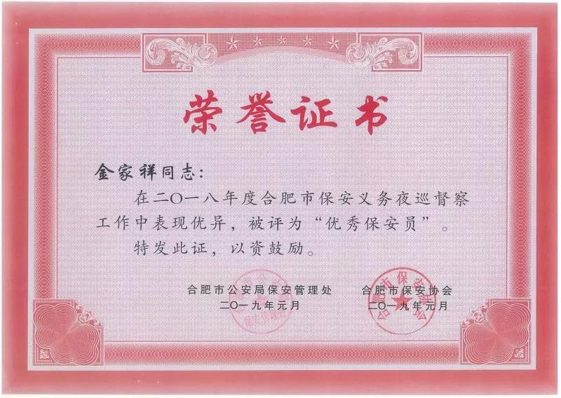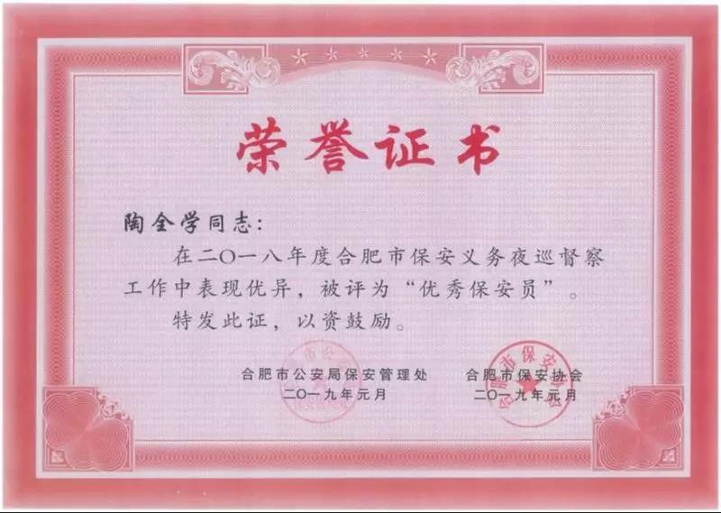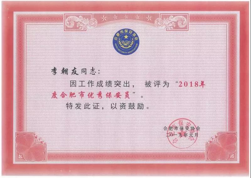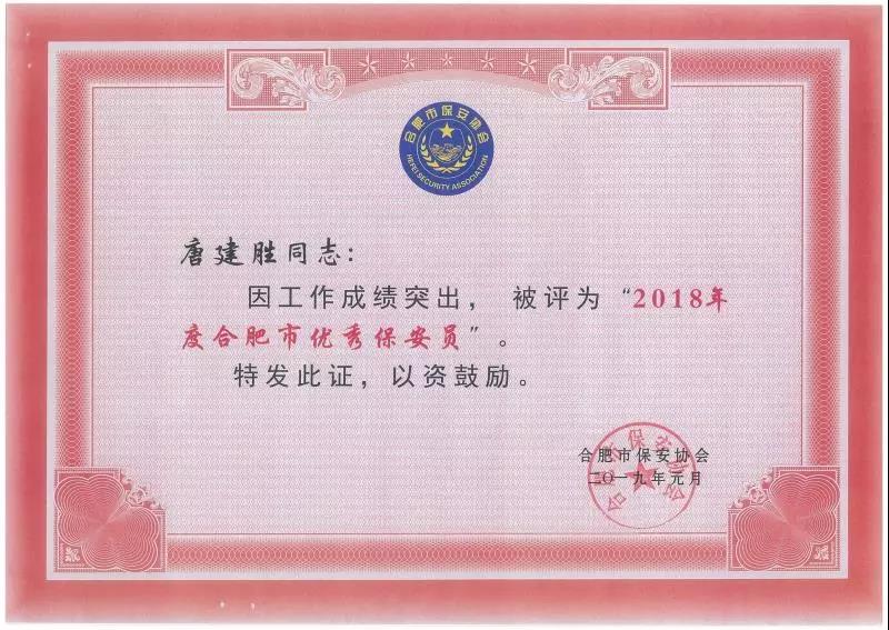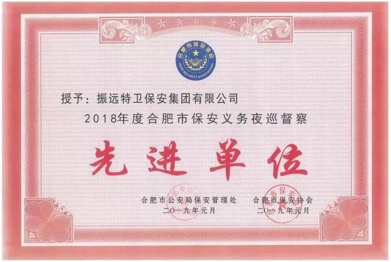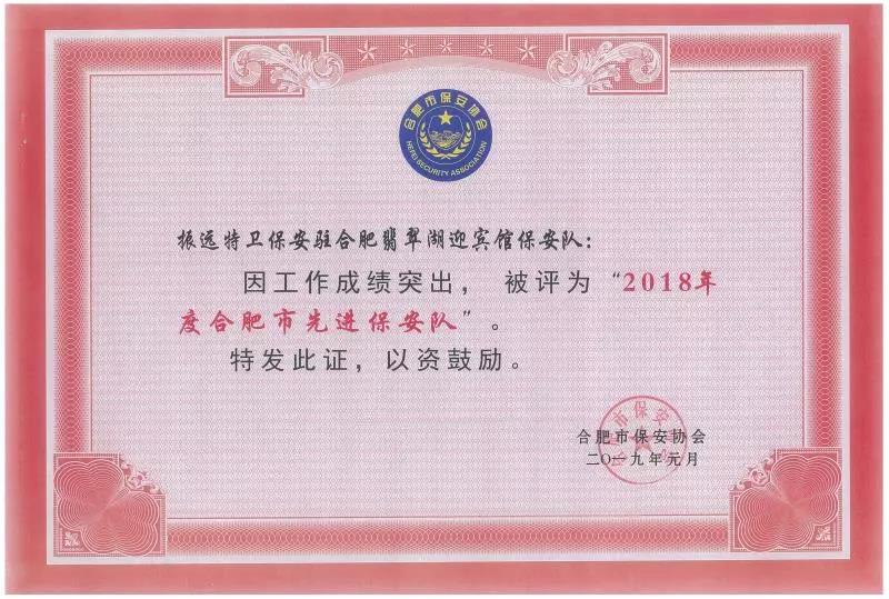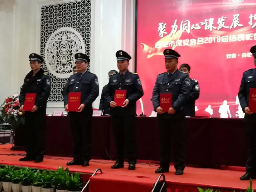 合肥市保安协会2018总结表彰盛典暨2019新春联欢晚会在安徽饭店召开,主题为“聚力同心谋发展 携手前行创未来”,晚会上对2018年度工作进行总结,并对表现优秀的保安公司进行表彰。振远特卫保安集团在2018年度合肥市保安服务行业年度先进评比活动中荣获合肥市公安局颁发的先进集体奖,集团公司驻合肥迎宾馆保安队荣获“合肥市先进保安队”。李朝友、唐建胜﹑金家祥等5人荣获“2018年度合肥市优秀保安员”等荣誉。