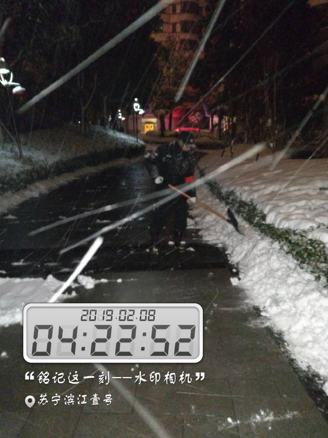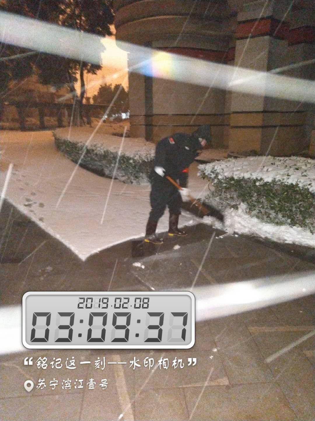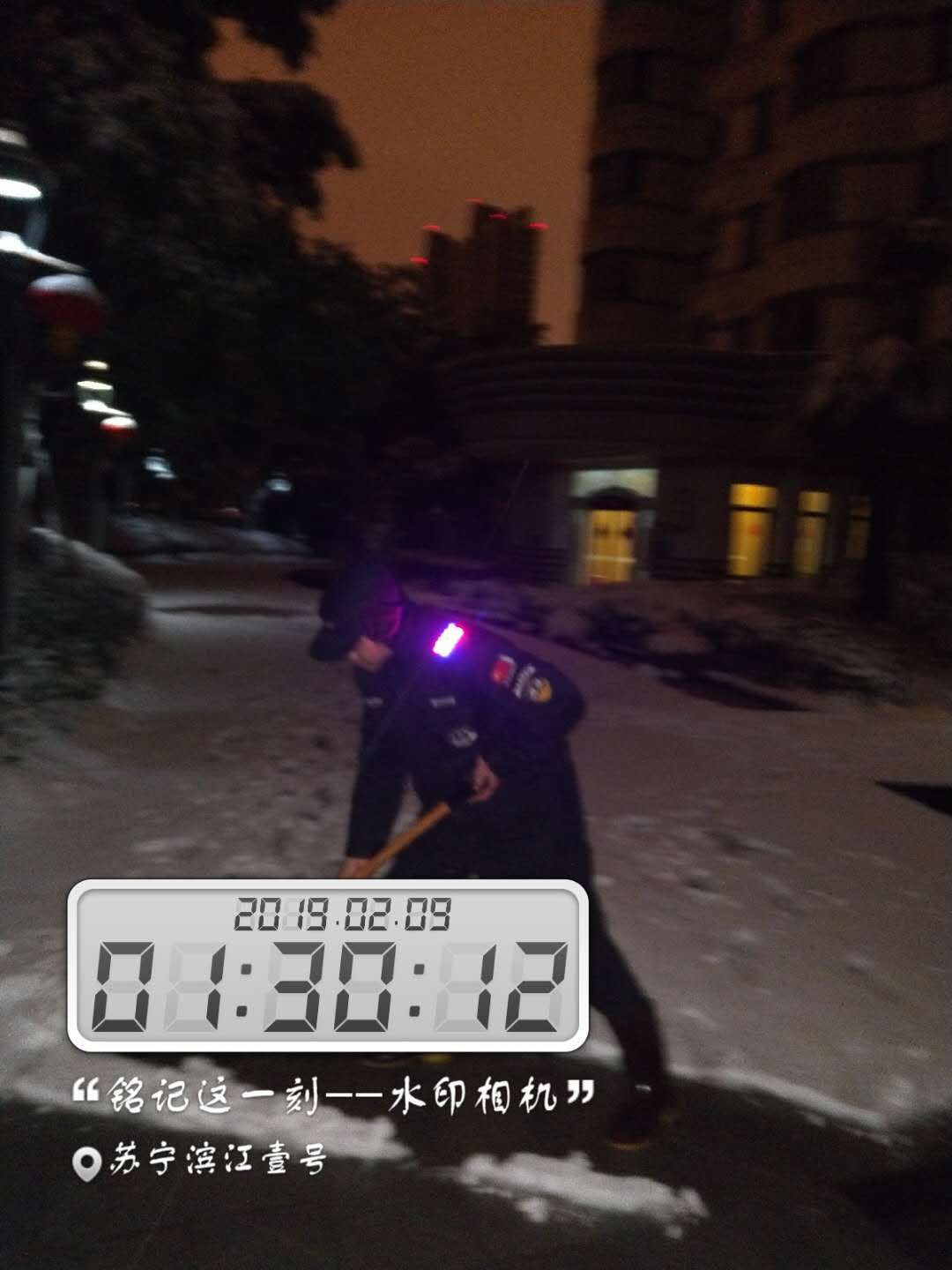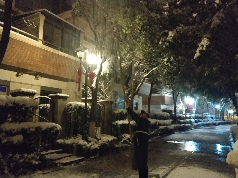 驻守在滨江壹号的振远保安员,春节值班人员吴松寿,连续两年留守项目没有回家过年,他在朋友圈写道:“团圆是别人的,我在扫雪。”