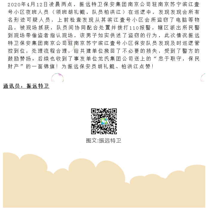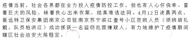 【南京公司】“疫”外收获——振远保安员胡礼鲲、柏洪江凌晨勇擒小偷
