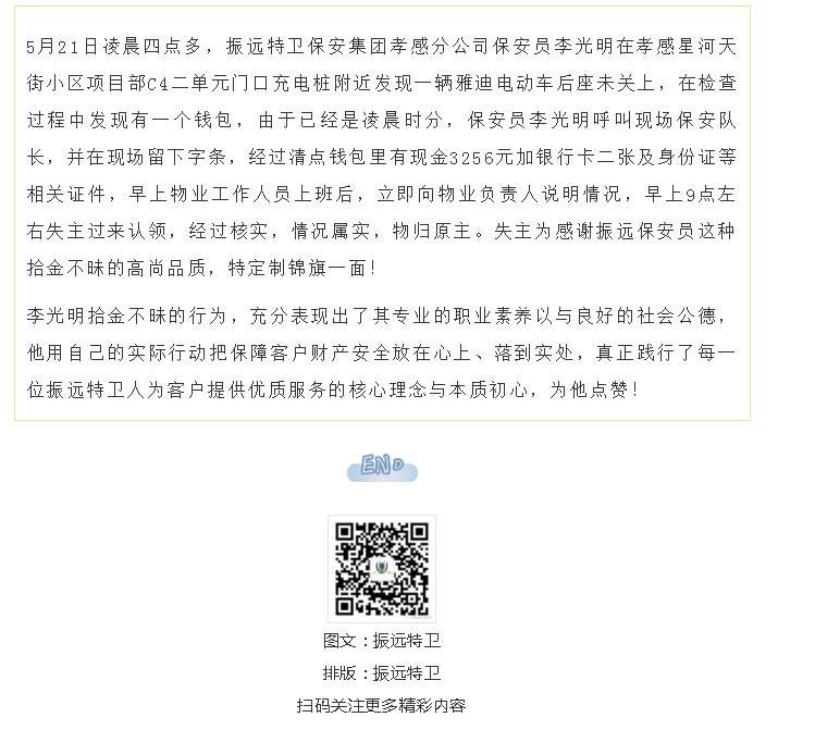 【孝感公司】完璧归赵|振远特卫保安员拾金不昧 妥善处置获得赞誉