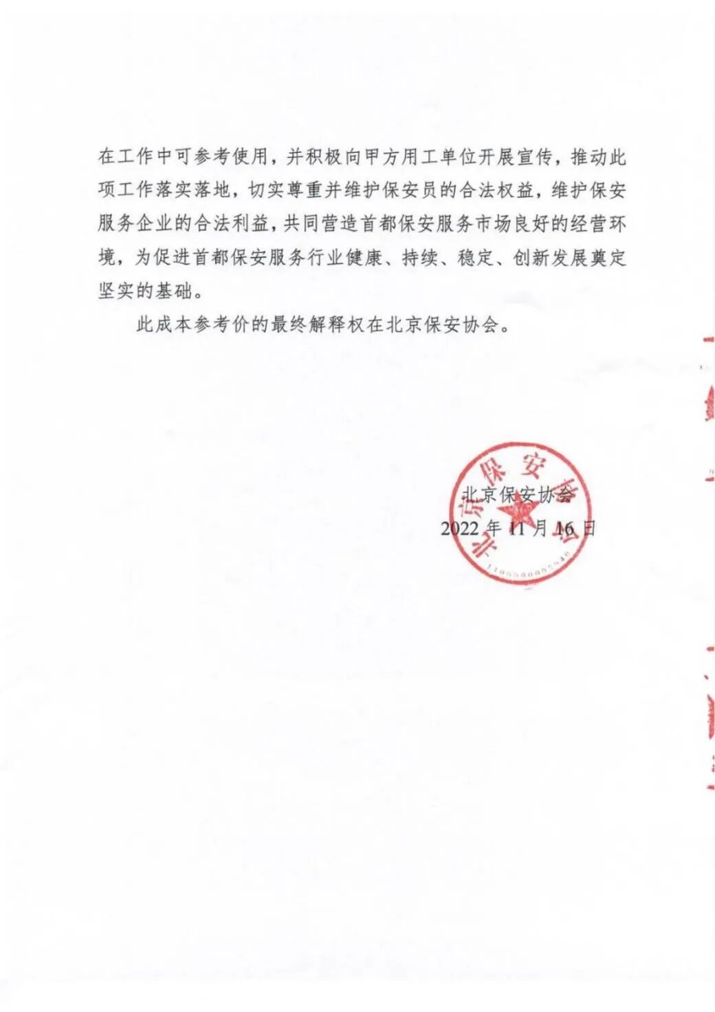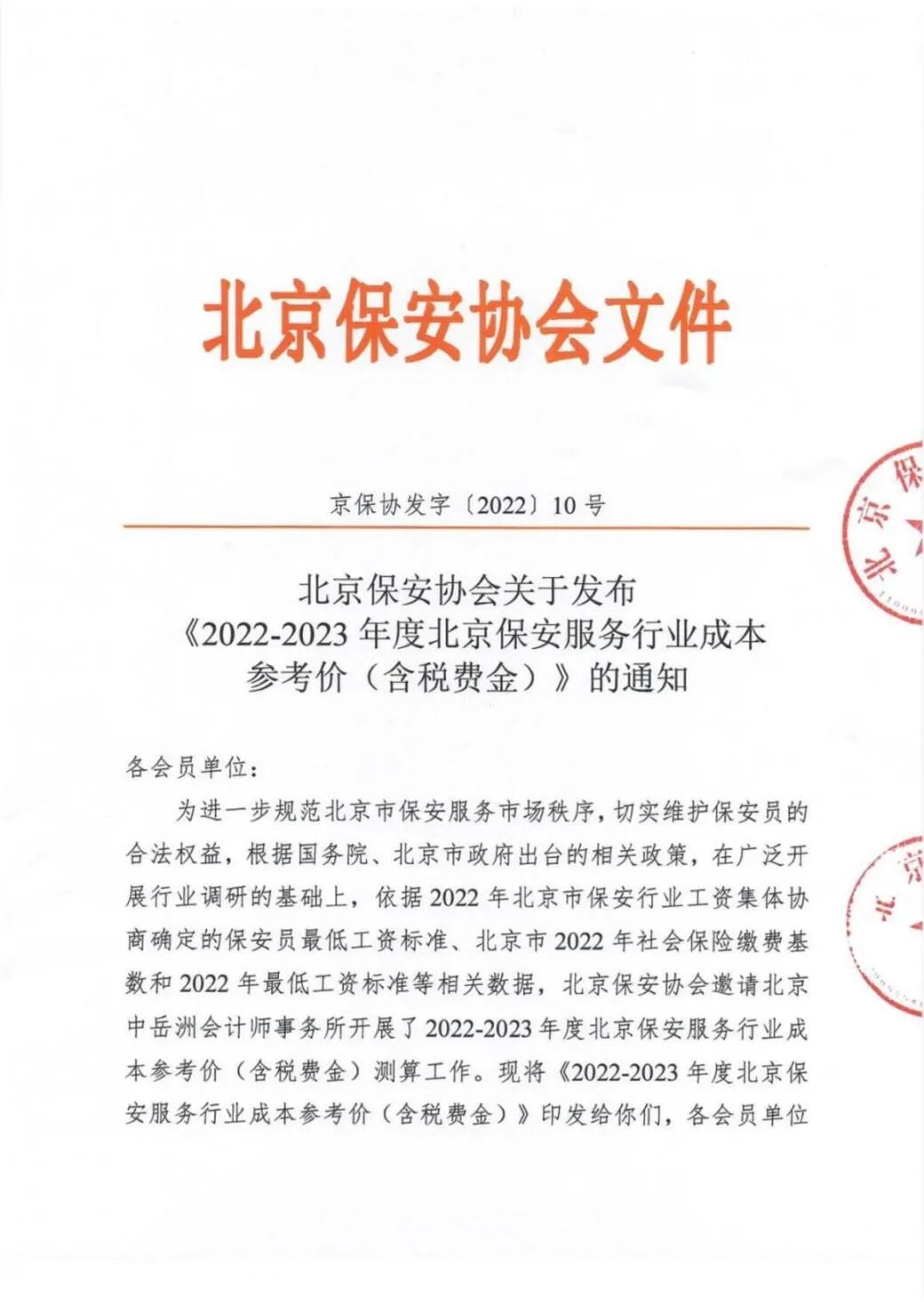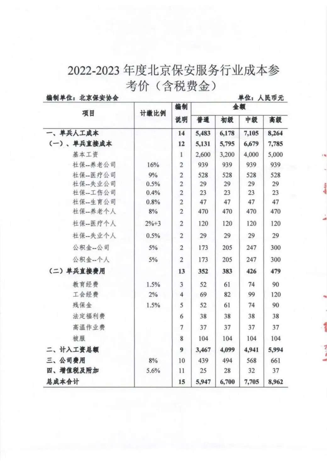 为进一步规范首都保安服务市场秩序,切实维护保安员的合法权益,根据国务院、北京市政府出台的相关政策,在广泛开展行业调研的基础上,依据北京市保安行业工资集体协商确定的保安员最低工资标准、北京市政府公布的社会保险缴费基数和北京市最低工资标准等相关数据,北京保安协会积极开展了2022-2023年度北京保安服务行业成本参考价(含税费金)测算工作,编制了《2022-2023年度北京保安服务行业成本参考价(含税费金)》(以下简称《成本参考价》),并于2022年11月25日正式发布。 北京保安协会领导对此项工作高度重视,将其列入年度重点工作,并指定专人推动落实。前期,协会积极开展行业调研,征求业内及法律相关专家意见,在人社局全市最低工资标准的基础上,经与行业工会集体协商,确定了北京市保安服务行业最低工资为2600元,并联合北京市保安服务行业工会联合会与全市600余家保安服务企业签署了《2022年北京市保安服务行业工资专项集体合同》,为编制《成本参考价》打下了坚实的基础。 在前期工作的基础上,北京保安协会聘请北京中岳洲会计师事务所,按照相关法律与政策规定,测算了2022-2023年度北京保安服务行业成本参考价(含税费金),出具了报告草案,并经协会常务理事会审议通过。2022年10月,《成本参考价》正式报告报北京市注册会计师协会备案,并向协会领导和市局治安总队领导做了汇报。 《成本参考价》共包含15项内容,充分考虑到以下因素:保安员基本工资;社会保险和住房公积金;按规定提取的三项经费(福利费、工会经费、教育经费);高温作业费;保安员所要配置的被服费用;残保金;合理的公司管理费用;增值税及附加税金,既包含了保安员人力服务成本,也包含了保安服务业微利收益,每一项都有相应的法律、法规为依据。按照《成本参考价》正式报告的结果,确定2022年至2023年度北京市保安服务行业成本参考价(含税费金):普通保安员为5947元。 北京市保安服务企业在实际工作中可参考使用《成本参考价》,并积极向甲方用工单位开展宣传,切实发挥其在企业发展中应有的作用。北京保安协会也将通过多种渠道向有关部门及全社会宣传《成本参考价》,充分发挥其在尊重并维护保安员和保安服务企业的合法权益、规范首都保安服务市场秩序等方面起到的积极作用,不断推动《成本参考价》落地落实,与保安服务企业共同营造首都保安服务市场良好的经营环境,为促进首都保安服务行业健康、持续、稳定、创新发展奠定坚实的基础。 附:《2022-2023年度北京保安服务行业成本参考价(含税费金)》