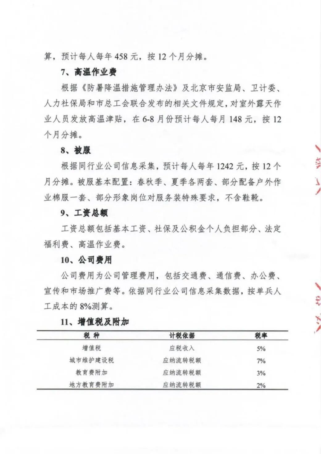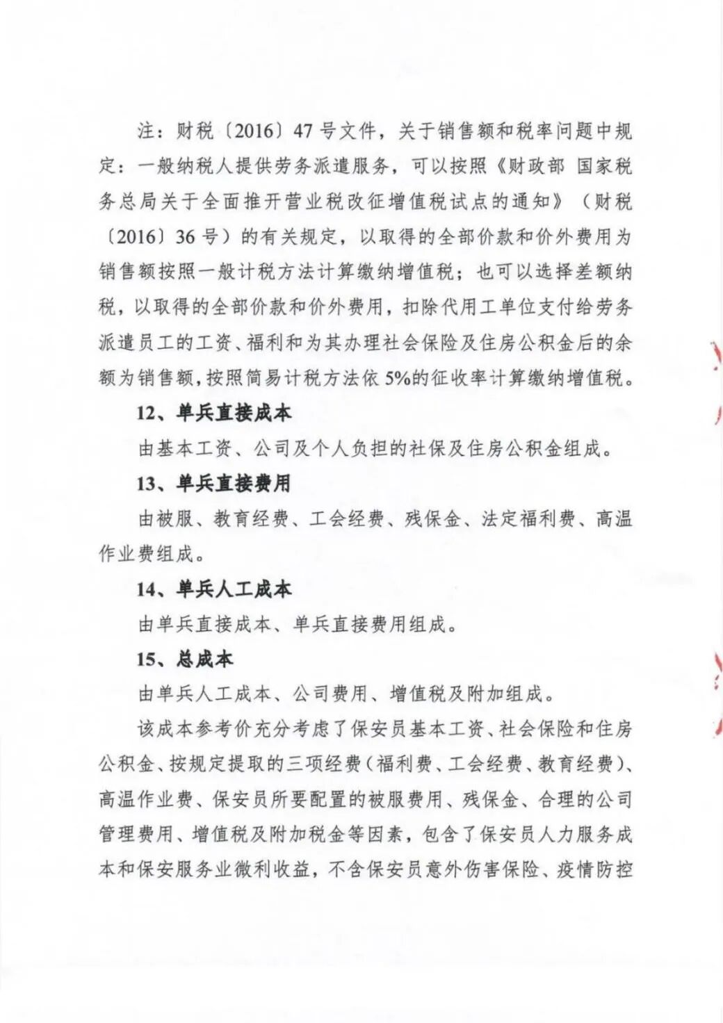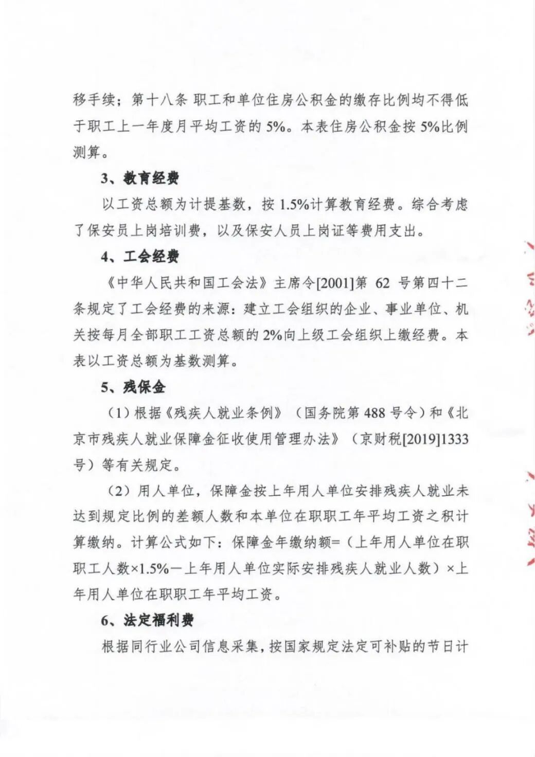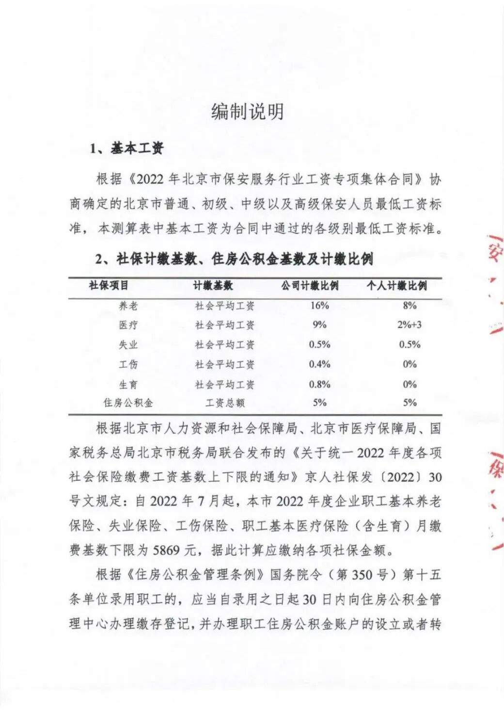 为进一步规范首都保安服务市场秩序,切实维护保安员的合法权益,根据国务院、北京市政府出台的相关政策,在广泛开展行业调研的基础上,依据北京市保安行业工资集体协商确定的保安员最低工资标准、北京市政府公布的社会保险缴费基数和北京市最低工资标准等相关数据,北京保安协会积极开展了2022-2023年度北京保安服务行业成本参考价(含税费金)测算工作,编制了《2022-2023年度北京保安服务行业成本参考价(含税费金)》(以下简称《成本参考价》),并于2022年11月25日正式发布。 北京保安协会领导对此项工作高度重视,将其列入年度重点工作,并指定专人推动落实。前期,协会积极开展行业调研,征求业内及法律相关专家意见,在人社局全市最低工资标准的基础上,经与行业工会集体协商,确定了北京市保安服务行业最低工资为2600元,并联合北京市保安服务行业工会联合会与全市600余家保安服务企业签署了《2022年北京市保安服务行业工资专项集体合同》,为编制《成本参考价》打下了坚实的基础。 在前期工作的基础上,北京保安协会聘请北京中岳洲会计师事务所,按照相关法律与政策规定,测算了2022-2023年度北京保安服务行业成本参考价(含税费金),出具了报告草案,并经协会常务理事会审议通过。2022年10月,《成本参考价》正式报告报北京市注册会计师协会备案,并向协会领导和市局治安总队领导做了汇报。 《成本参考价》共包含15项内容,充分考虑到以下因素:保安员基本工资;社会保险和住房公积金;按规定提取的三项经费(福利费、工会经费、教育经费);高温作业费;保安员所要配置的被服费用;残保金;合理的公司管理费用;增值税及附加税金,既包含了保安员人力服务成本,也包含了保安服务业微利收益,每一项都有相应的法律、法规为依据。按照《成本参考价》正式报告的结果,确定2022年至2023年度北京市保安服务行业成本参考价(含税费金):普通保安员为5947元。 北京市保安服务企业在实际工作中可参考使用《成本参考价》,并积极向甲方用工单位开展宣传,切实发挥其在企业发展中应有的作用。北京保安协会也将通过多种渠道向有关部门及全社会宣传《成本参考价》,充分发挥其在尊重并维护保安员和保安服务企业的合法权益、规范首都保安服务市场秩序等方面起到的积极作用,不断推动《成本参考价》落地落实,与保安服务企业共同营造首都保安服务市场良好的经营环境,为促进首都保安服务行业健康、持续、稳定、创新发展奠定坚实的基础。 附:《2022-2023年度北京保安服务行业成本参考价(含税费金)》