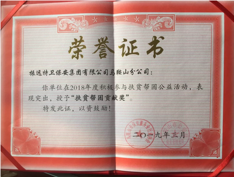振远特卫保安集团马鞍山公司在总经理胡正荣的带领下积极承担社会责任、热心公益事业,振远特卫保安集团马鞍山分公司被马鞍山市公安局﹑及保安协会授予“扶贫帮困贡献奖”;同时保安员刘健强被马鞍山市保安协会评为市优秀保安员。